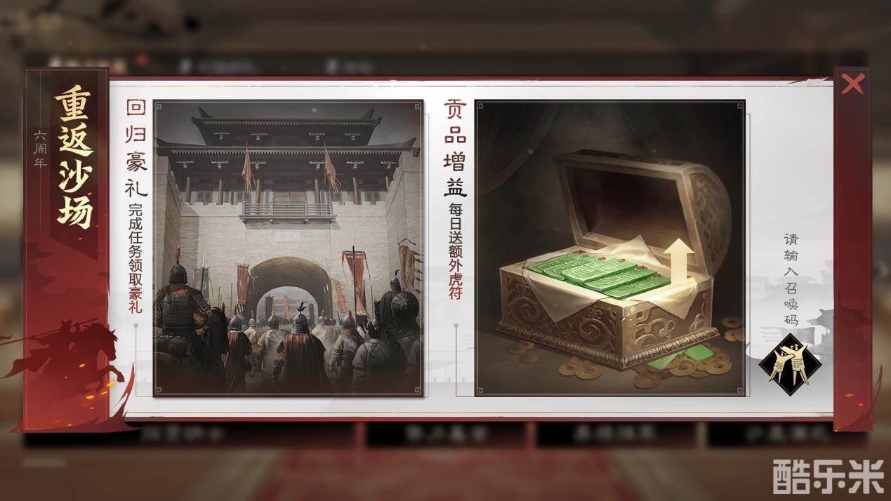 ·回归玩家在活动期间购买月卡,还可激活贡品增益,每日领取贡品玉符奖励时可额外获得虎符奖励