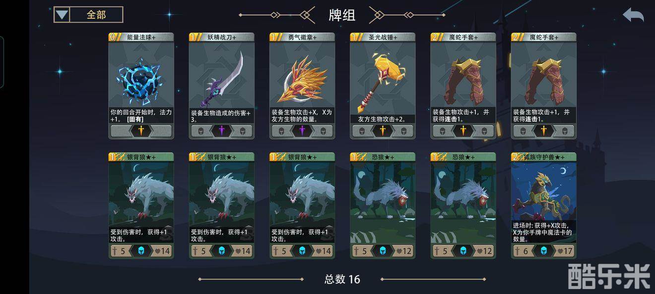 道具:拿开局衍生恐狼和小精灵快速铺场,还有一个开局手牌加入一张野兽咆哮也要拿,其他的挑一些实用的,开局拿牌之类的有效补充手牌(卡组里就不必带补牌卡片,污染卡池)