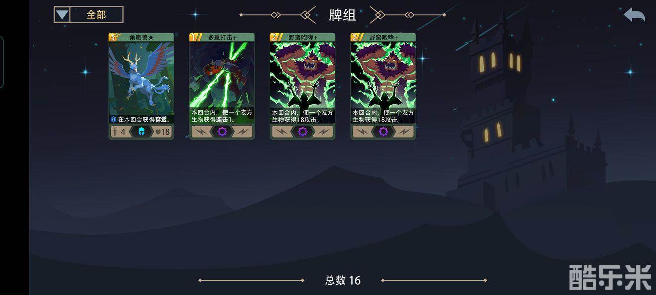 核心卡片:1费狼 多重打击 2费魔蛇手套 野兽咆哮(图片中的守护兽和角鹰用来刷经验,不需要特意拿)