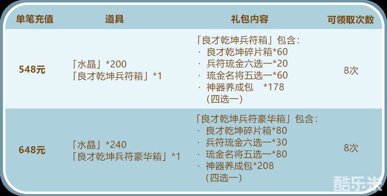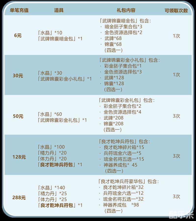 每天充值指定金额即可获得绝世良才碎片箱、牛转乾坤碎片箱、兵符琉金六选一、神器养成包珍稀资源,还可以和水晶翻倍的充值活动叠加哦!
