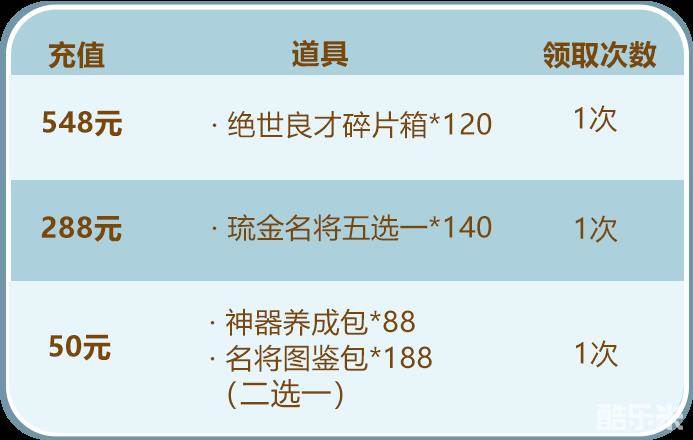 少年们单笔充值指定金额,即可得到绝世良才碎片箱、琉金名将五选一及丰厚的养成资源!少年们千万不要错过哟~