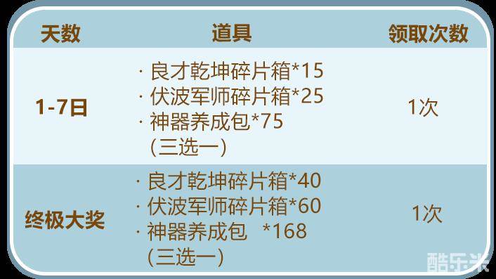 1-7日可领取:「良才乾坤碎片箱」*15 或 「伏波军师碎片箱」*25 或「神器养成包」*75
