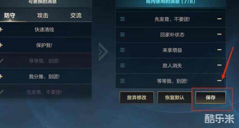 4,我们只需要将我们需要的快捷语句更换到右边的局内使用消息一栏中,然后记得点击保存即可更改我们的的快捷消息。
