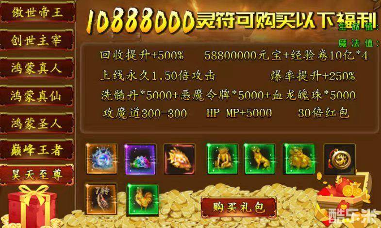 独家礼包(VIP777):绑定灵符*2W、书页*30、恶魔令牌*50、强化宝石*5