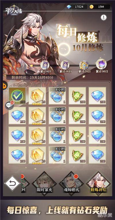 除此之外,在“学院活动”中打开每日修炼,每个月都有不同的修炼奖励,上线就能领取,也是美滋滋。每月奖励不仅包含大量钻石,还有大量五星镜灵,50个就能合成随机五星魂师,简直不要太良心。按时登录累积达到一定天数后,还可以领取累积奖励,灵魂契约和先知水晶都有,指定属性魂师等你来拿。