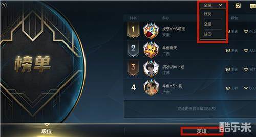 然后会默认进入好友的段位排行榜,可通过右上角的分栏切换为全服段位排行榜。如果你想要查看单个英雄的排名,需要点击右下角的[英雄]一项。