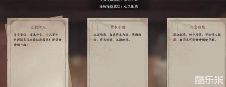在接到这个特殊任务之后,玩家要来到城中的布告栏位置进行查看。靠近之后可以看到布告栏上面有三个任务,一个是且救陌生人,一个是紫衣千粉,第三个是心念旧思,这三个任务都是要完成的。