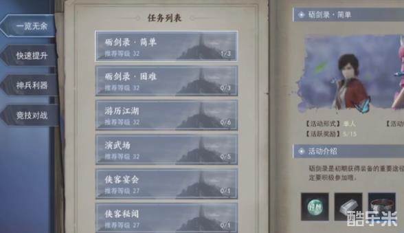 砺剑录这个玩法是属于挑战类型的玩法,对于侠客的实力是有一定要求的。开启的等级是30级的时候开启,这个玩法的前置还是有一定要求的。既然是挑战玩法,那么对于侠客战力肯定是要做好准备的,搭配方面也建议是一个战士和一个法师,或者说医师侠客来战斗,会相对的轻松一些。