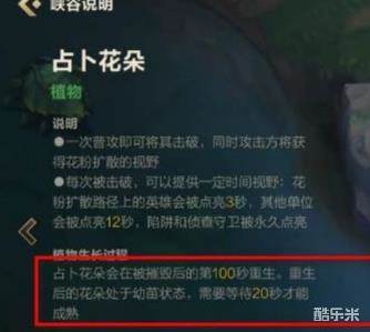 占卜花朵在LOL端游里面就有,如今在手游里面依旧亮相,它的主要用途就在于,小伙伴们击破花朵之后可以获得一定时间的视野,花粉扩散路径上的英雄将被点亮三秒,其他单位则点亮十二秒,至于陷阱以及侦查守卫会一直点亮。