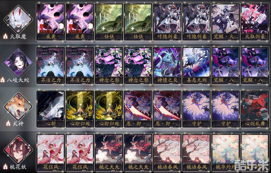 而八岐大蛇的加入解决了该体系以往制胜点单一的缺陷。并在构筑上调整了火取魔的卡位,使该卡组每个阶段都有不同的施压点:二勾阶段,利用叶隐剑豪的巨大身材打场面;三勾阶段,觉醒·八岐大蛇入场主导局势。