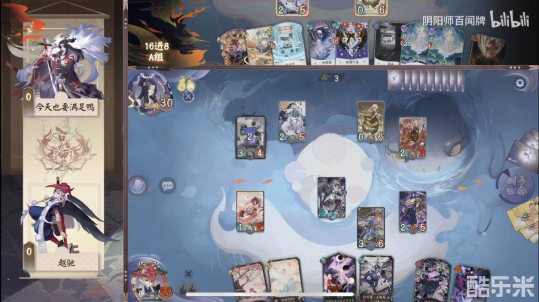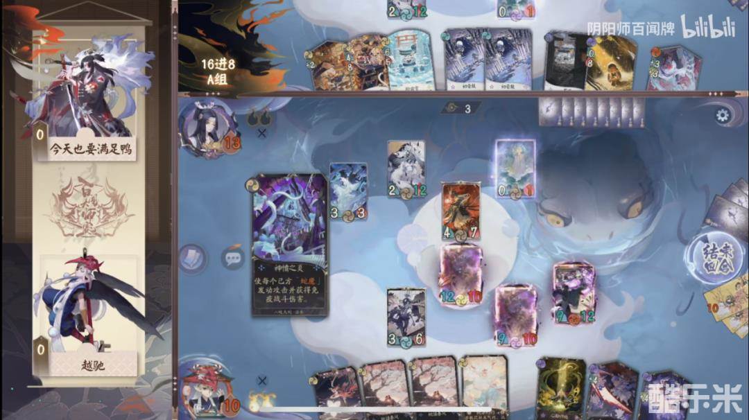 越驰为了保证二勾的施压,利用花信风检索了火取魔的牌并找到了期望的叶隐剑豪。在二勾阶段准时入场,9-9的叶隐剑豪制霸了战斗区。紫岩队见势不妙,利用大量的优质资源来勉强抵挡几轮进攻。然而在这般防守之下,仍然被打下了一半的血量。