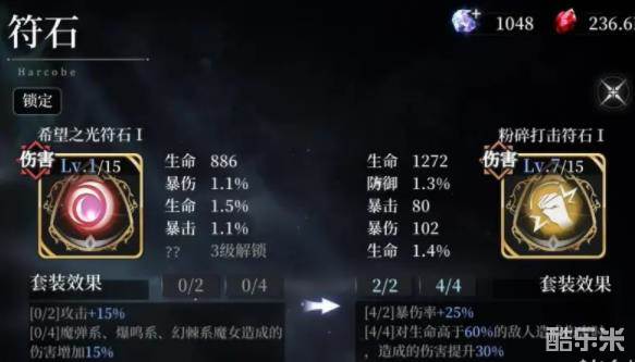 符石是这款游戏养成线最长的目标,该系统可以类比原神的圣遗物系统,每个角色有六个符石槽,而符石也是成套的,两件套和四件套都有不一样的加成,所以最常见的搭配就是搭配一套四件套,和一套两件套。