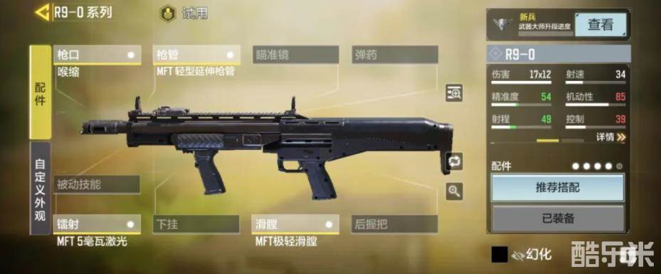 枪口与枪管处,分别采用喉缩和MFT轻型延伸枪管,在牺牲小部分机动性的同时,显著缩小了举镜射击与腰射的弹丸散布,并且延长了R9-0的射程。而滑膛与镭射则采用了MFT极轻滑膛与MFT 5毫瓦激光,不但能够进一步缩小腰射散布,还能有效缩短拉栓时间提升举镜速度,降低了R9-0实战时的跑射延迟,弥补枪口与枪管配件在机动性上带来的负面影响。