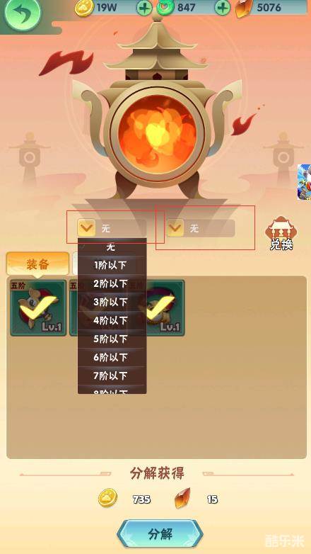 4.如何多选或者快速选中部分需要分解的装备,如下图我们可以选择分解XX阶以下的装备,还可以选择分解某种品质以下的装备
