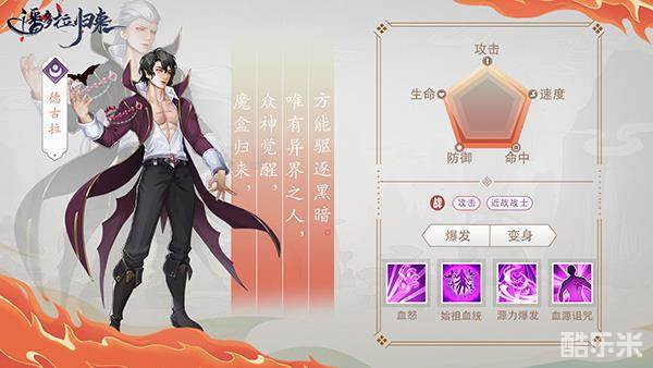 德古拉是继夜王之后,又一暗系的主力战将,拥有恐怖攻击力,以及给予敌人附加【咒印】的恐怖能力。这里丘比特偷偷的小声跟大家说噢,德古拉是目前为止,唯一一个拥有二段变身的英雄噢。触发条件是血量低于50%,德古拉就会化身为吸血鬼之王,让自身的战力变得更加强大,秒杀全场!