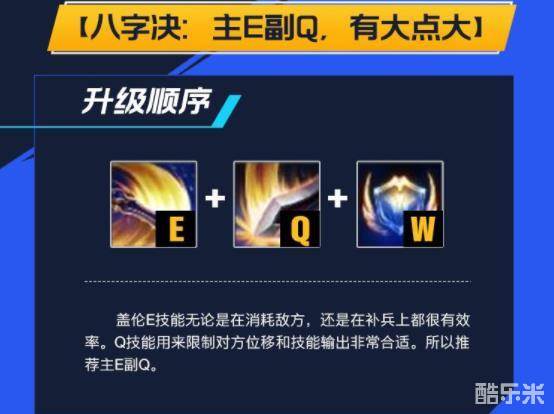 解析:3技能是盖伦的主要输出技能,不论是消耗还是补兵都非常有优势。