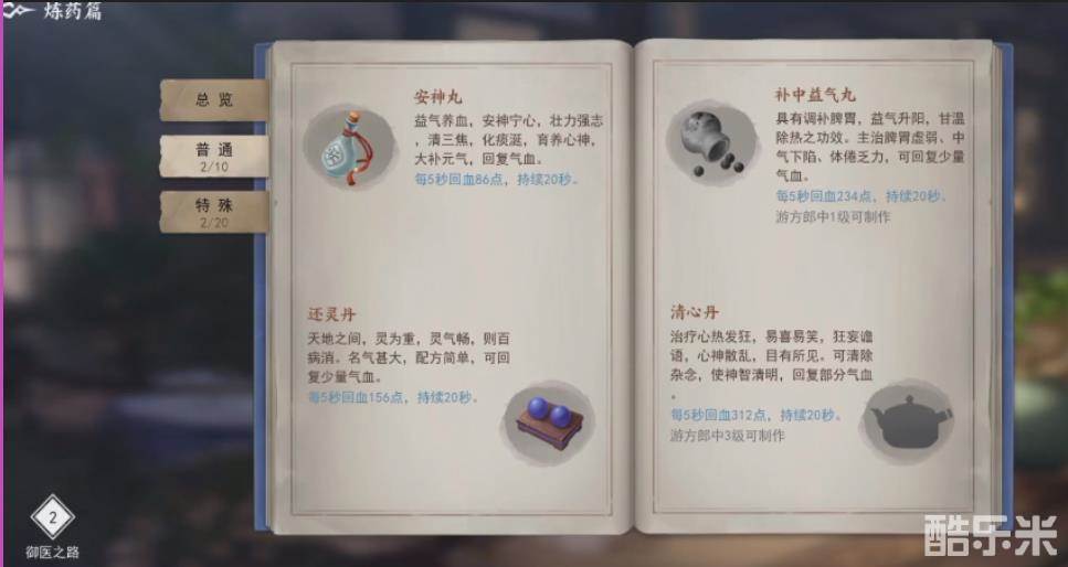 基础的一些配方道具还可以通过购买和一些任务来获得,但是高级的特殊除了一些机遇或者说大型的战斗之外,想要获取的话难度是比较高的。在刚解锁的时候会提供两个默认的药品给玩家,可以尝试着制作一下。