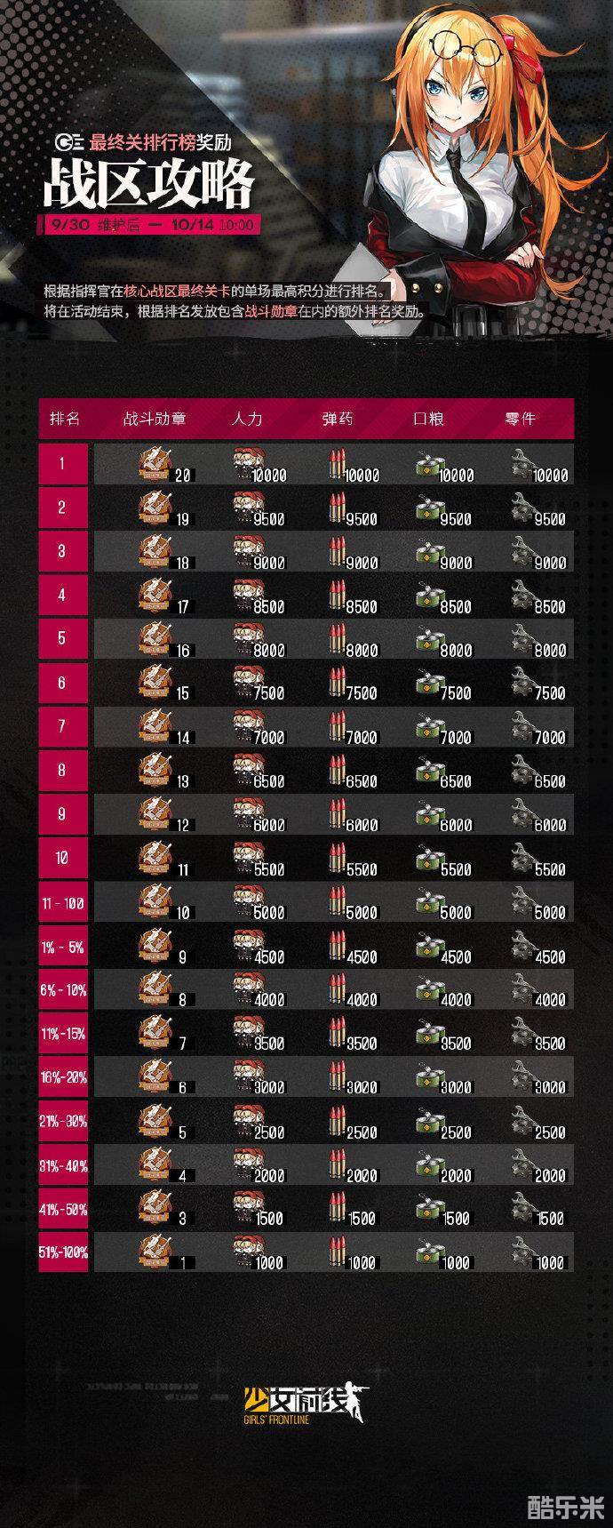 根据指挥官在核心战区最终关卡的单场最高积分进行排名。将在活动结束,根据排名发放包含战斗勋章在内的额外排名奖励。