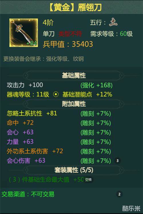 比如说你本身是土系职业,你有紫色单手刀武器兵甲值很高,五行也是正确的,但是它的词条全是格挡、体质;你有蓝色单手刀,兵甲值低一些,但是它的词条是力量、外功土系伤害等输出词条,这时候不要在意兵甲值高低,一定要带词条正确的武器。