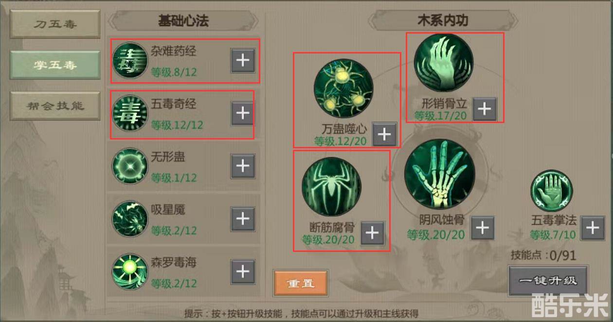 掌五毒属于群攻强力输出职业,所以技能优先点: