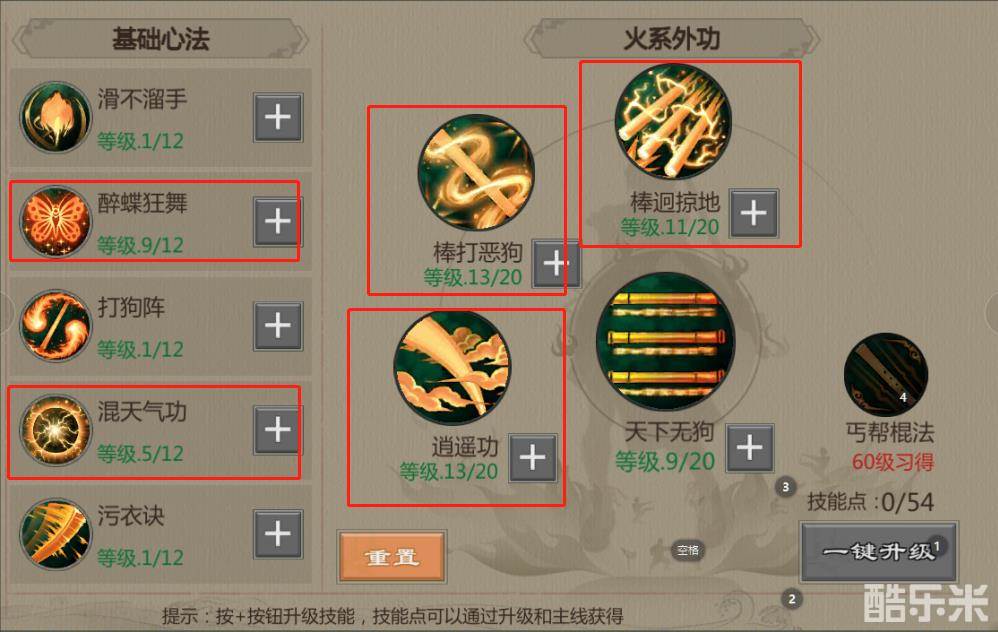 棍丐帮属于强力输出职业,所以技能优先点: