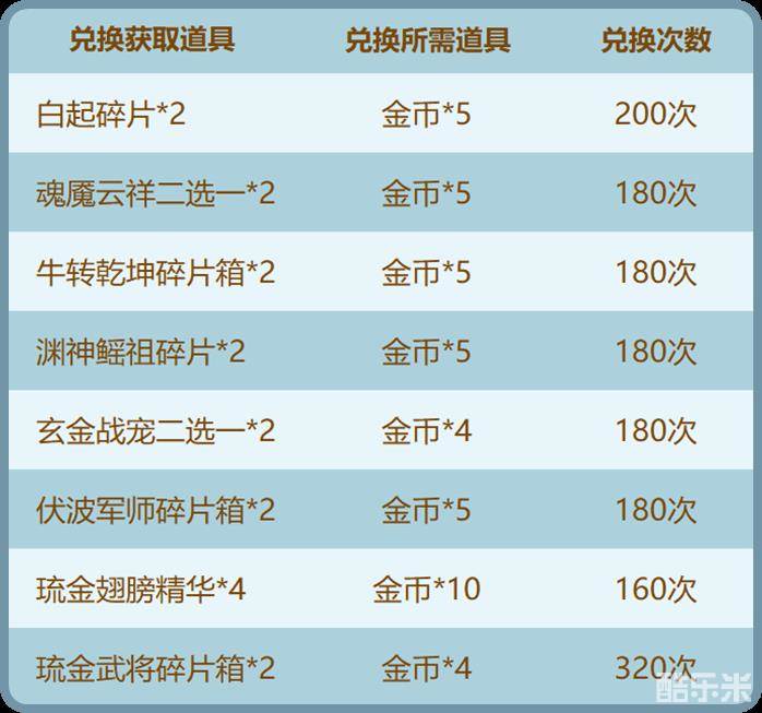 1、「欢乐金币」可以兑换:白起碎片、魂魇云祥二选一、牛转乾坤碎片箱、渊神鳐祖碎片、玄金战宠二选一、伏波军师碎片箱、琉金翅膀精华、琉金武将碎片箱、明夷无妄二选一、开天三清二选一、玄黄元始二选一、琉金名将五选一等。