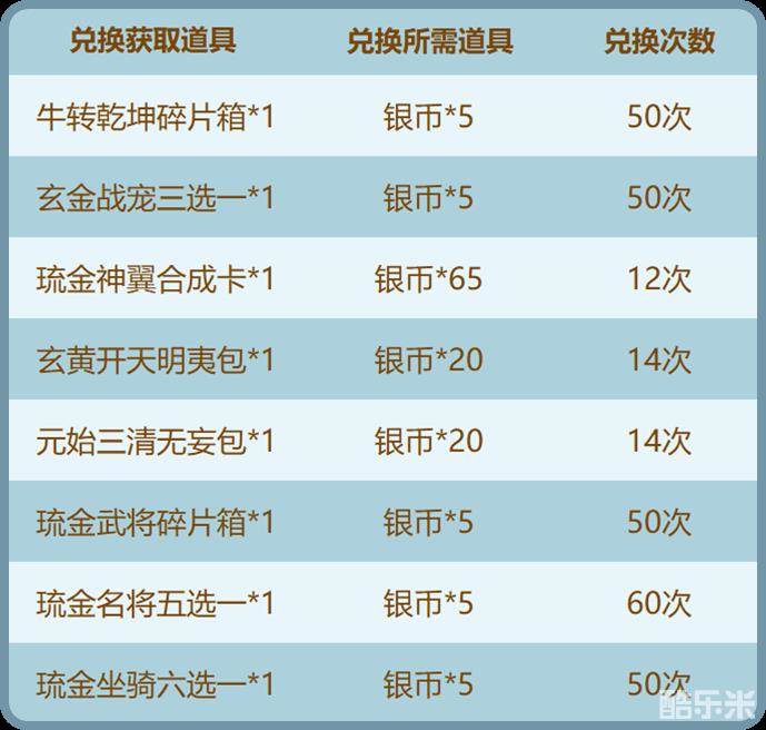 2、「欢乐银币」可以兑换:牛转乾坤碎片箱、玄金战宠三选一、琉金神翼合成卡、玄黄开天明夷包、元始三清无妄包、琉金武将碎片箱、琉金名将五选一、琉金坐骑六选一、琉金神兵碎片箱、琉金装碎片任选箱、琉金宝碎片任选包、穷奇琉金五选一、云麾龙骧碎片箱等。