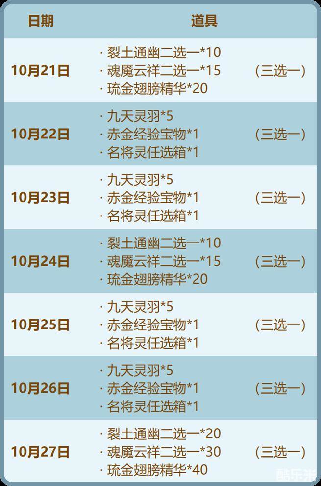 少年们能拿到丰厚的裂土通幽二选一、魂魇云祥二选一、琉金翅膀精华、九天灵羽、赤金经验宝物、名将灵任选箱等资源哦~