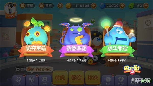 《保卫萝卜3》除了承接前作传统的冒险玩法外,还创新性的设计了比赛、冒险两大模式。玩家可以通过冒险模式不断挑战自己的塔防建造技巧,也可以通过比赛模式中的糖果赛和赏金赛与好友一比高下,体验新奇的战斗乐趣;每日的挑战模式也是万万不可错过的,其中抢夺宝箱是用来获取稀有道具,角色收集是用来收集升级角色的宝贵碎片,战斗考验更用来检验玩家的实战技巧。三种模式,不同的玩法,不同的乐趣。