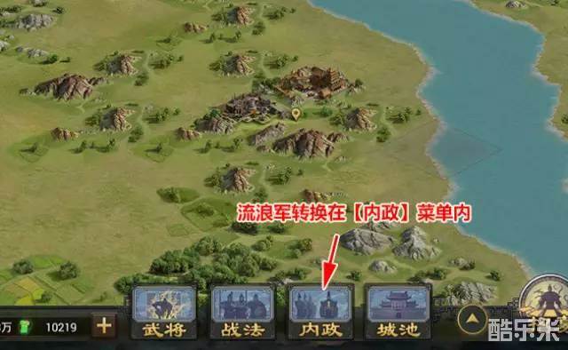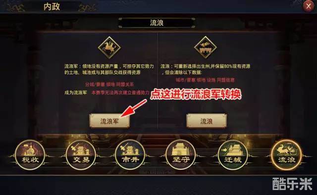 一、点击主界面菜单【内政】按钮后,点击最后的【流浪】界面,如果符合加入流浪军的要求,就会出现流浪军选项:
