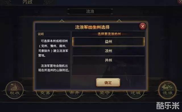 二、点击【流浪军】选项并确定后会让你选择一个出生州,流浪军营地会随机出现在所选州的山脉附近。需要注意的是,只可以选择本州或者相邻的州府建立营地,司隶等资源州除外。