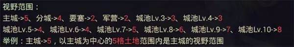 这里的视野指的是建筑的视野(各建筑视野如下图),即需要在流浪军营地的2格范围内建造要塞才能看到流浪军营地,领地是不行的哦。