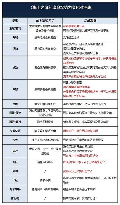 成为流浪军后在资源获取、税收方式等等多个方面都会有较大变化,具体详情可以参考如下流浪军势力变化对照表: