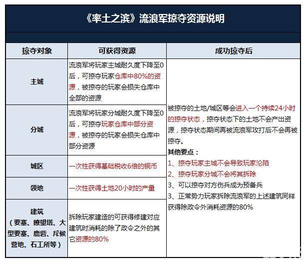 掠夺是掠夺正常势力玩家的领地或者城区各种资源,是流浪军获得资源的主要途径,具体可获得的资源如下表: