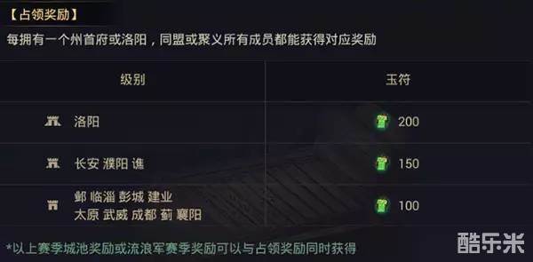 赛季结算时,根据全体流浪军占领的州府(含洛阳)数量以及流浪军的武勋排名,决定奖励。奖励内容包括:割据卡包抽取次数,以及玉符等。奖励将在赛季切换完毕后直接发送到角色帐号中,具体奖励规则如下:
