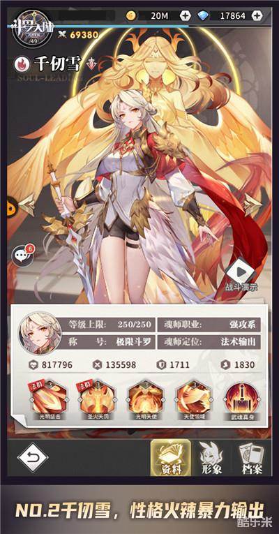 这种豪爽泼辣的性格也体现到了《斗罗大陆:武魂觉醒》千仞雪的角色定位中,她擅长暴力群攻输出,美艳之中又暗含杀戮。她的技能可以挥舞天使之剑降下光明惩罚,对敌方中间4名魂师造成伤害,还可以驱散目标任意2个有益BUFDF。而且千仞雪的大部分技能还能释放灼烧类效果,增加暴击属性,输出能力可谓非常强势。