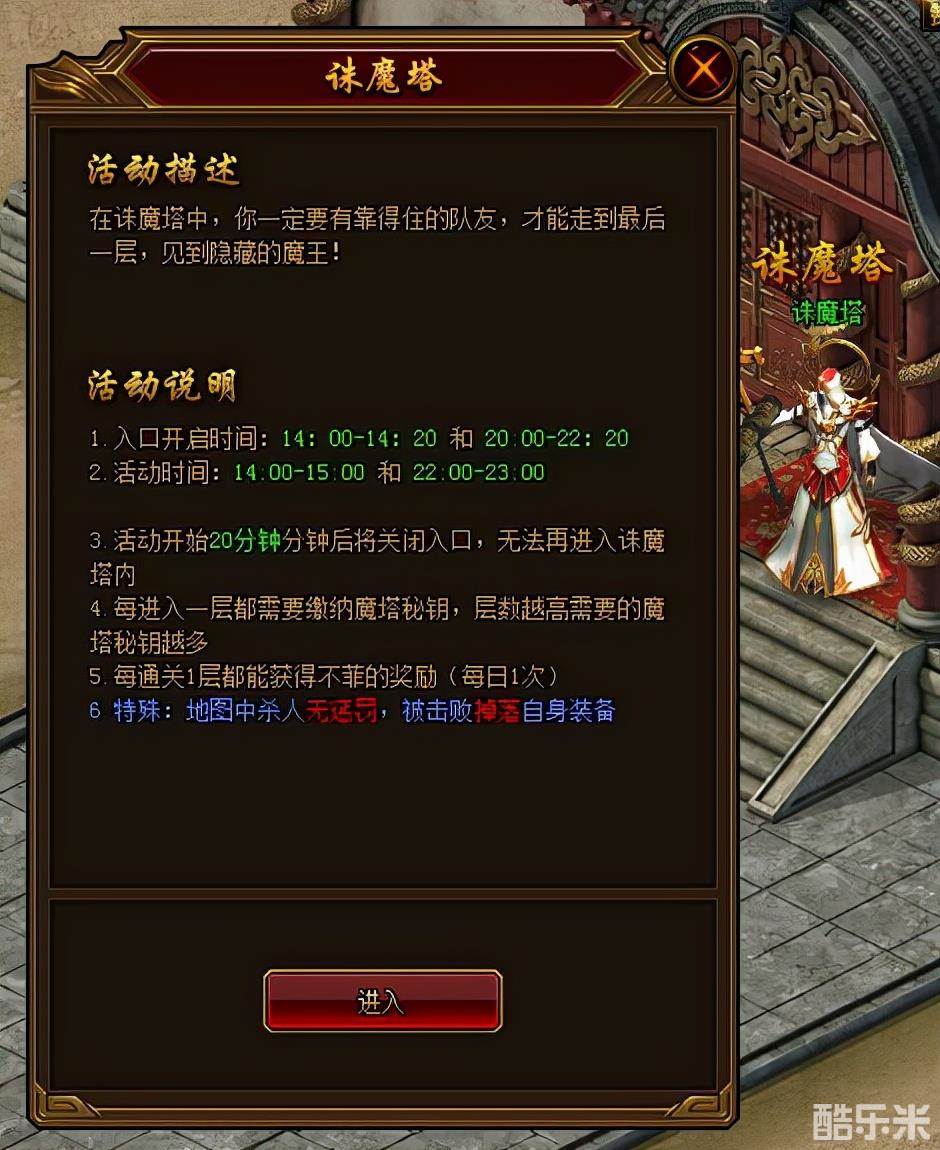 玩家等级需要满足220级时,才能参加诛魔塔的日常活动,这项活动每天开放两次。其中,入口开放时间为每天14:00-14:20和20:00-22:20,而活动参与时间为14:00-15:00和20:00-23:00。