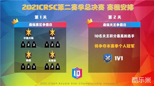冲向亚洲之巅,天王即将加冕!本周六至周日每天17点,2021皇室战争十大天王争霸赛CRSC第二赛季总决赛就将点燃战火,中国大陆、日本、东南亚、韩国四大赛区巅峰对决,Auk、嗨尔、PANDORA、KK等十位顶尖高手捉对厮杀,上赛季豪取双冠王的中国大陆赛区将踏上卫冕双冠的征程!