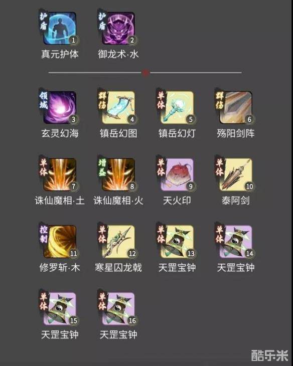 大成相较于混元的神通搭配其实没什么变化,但由于大成蓝量奇缺,可以按我刚刚上面分析四个神通盾里写的来调整,单盾的话可以用困龙手填入空出来的神通位。