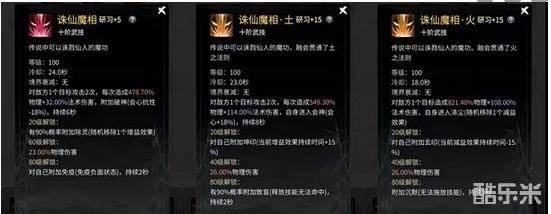 三诛仙魔相:诛仙魔相与法修的太一神光一样,一出生注定是核心技能。诛仙魔相在混元期解锁后就是几乎必带的技能,优先级较高,效果与困龙手类似,但是不管是伤害还是提供的免控时间都不如困龙手。因此在诛仙土和诛仙火解锁后,我认为可以考虑不带它玩儿了(个人观点)。而诛仙火和诛仙土这两个老大哥,拥有“致盲”和“沉默”这两个不吃控制抵抗的能力,是体修最优先选择的神通之二。(优先研习)