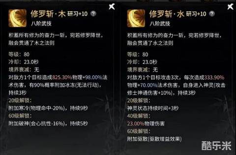三修罗斩:作为破虚后的主要输出技能,修罗木以及修罗水也同样是到了大成可以携带的优质技能。修罗木的控制不必多说,修罗水在打法修时用来清宠也不错。至于修罗斩则是可以替换的技能,如在破虚最常见的“双盾+困龙手+三修罗”这一套组合里,将修罗斩换成剑阵也未尝不可。修罗木、水的优先级高,修罗斩则是破虚时优先级较高,混元后舍弃。