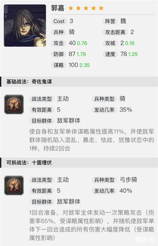 接下来说战法,35%几率、瞬发、有效距离5、2个目标、4种控制随机一种(注意的是这里2个目标一定是受到同一种控制,只随机一次),还附带自己和随机友方一人25%的谋略提升,持续2回合。在当前,大郭嘉可以说是主动战法里的控制最强的存在了。