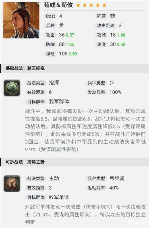俗称“二狗”,我们还是从三围说起。0.57的【攻击】,因为战法的关系有一定的普攻伤害;1.85的【防御】相当不错,可作为前排存在;2.59的【谋略】成长属于优质以上,适合各种谋略技能;0.53的【速度】偏慢,起手出手靠后,但是依靠战法效果,中期可以改变出手顺序;【攻击距离】为3,还不错,不容易受“回马”影响;cost值4略高,高cost值意味更高的属性,但是搭配会有所局限,需要注意。