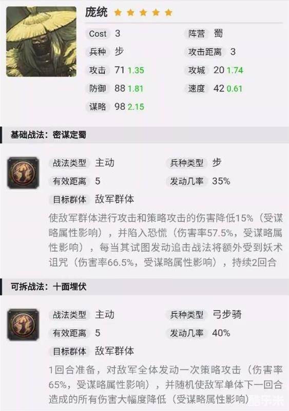 接下来说搭配,由于战法有5距离,并且伤害不俗,所以庞统是可以做大营的。但是2.16的谋略成长不算高,大营庞统的输出比不上法系大营武将,所以庞统大营往往需要由前锋中军补足输出(比如蜀之智,诸葛和徐庶分担输出压力),或者给庞统强力的战法(比如“不攻”、“十面埋伏”),但是性价比一般。