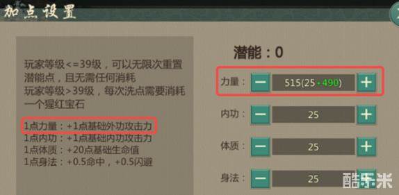 人物升级获得的潜能点,这里选择以力量为主的方式,前文提到,刀少林定位是金系外功系远程职业,自身技能针对敌方玩家主要以群体悬晕、受伤、范围打击效果,因此在潜能加点需要考虑自身远程输出的同时最大化的造成伤害,主加力量属性点来保证伤害最大化,同时面对的团战生存环境,自身的群体控制技能更能保证自身在团战的持续输出能力。潜能点内的力量契合外功攻击。