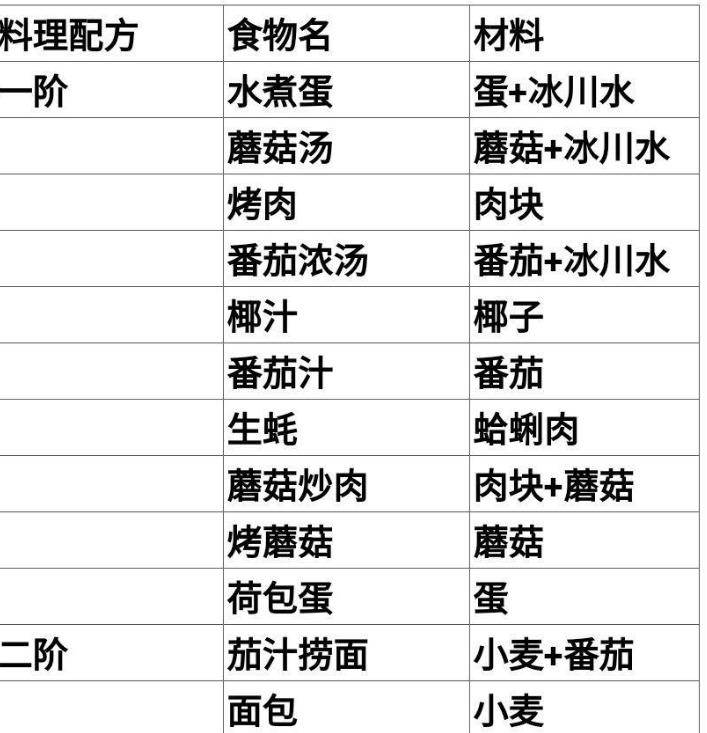 而在为了某个任务烹饪食物的时候,小伙伴们可以按照下面的食谱配方来进行制作,当然有的也可以自行发挥,有的食谱就算缺了某种材料也可以烹饪获得的。