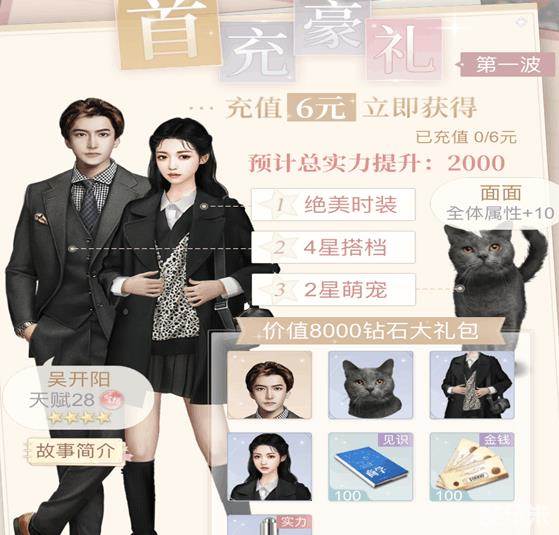 第一波首冲奖励为首冲6元立即获得7重大礼,可获得搭档程序员吴开阳、气场宠物猫面面、连衣裙-设计学院、发型温柔流淌、1万点见识、1万金钱、幸运喷雾50。预计总实力提升2000。