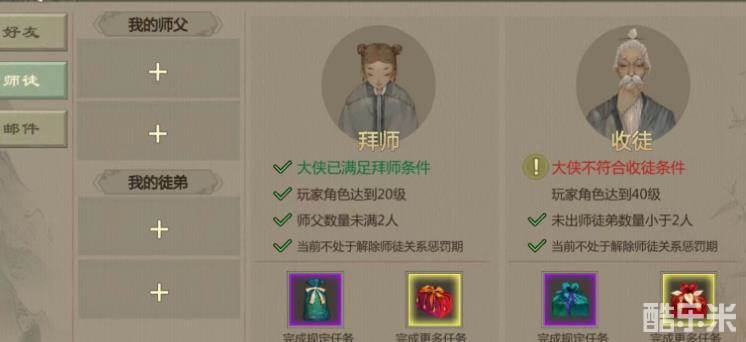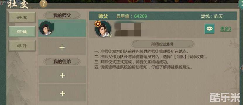 玩家进入游戏后,可以在主页面中看到社交活动,在社交活动中包括好友,师徒,邮件,选择师徒中可以看到我的师傅,我的徒弟等相应列表排行,可以选大于等于三级以上的少侠发起拜师请求,自身需要满足以下条件等级达到20级,师傅数量未满两人时,当前不处于解除师徒关系惩罚期,都可以进行相应的拜师任务。