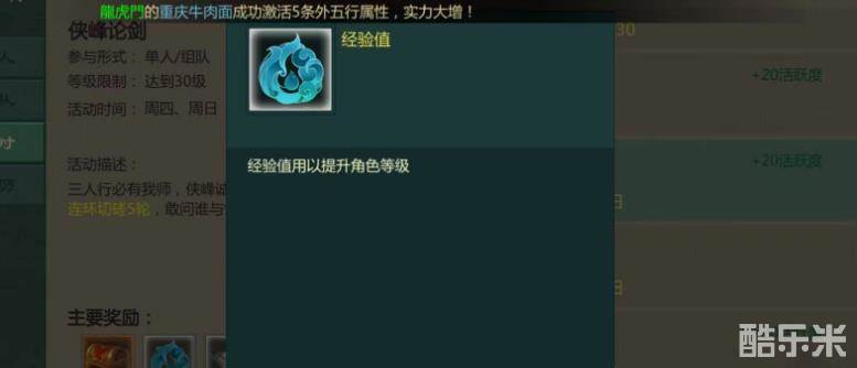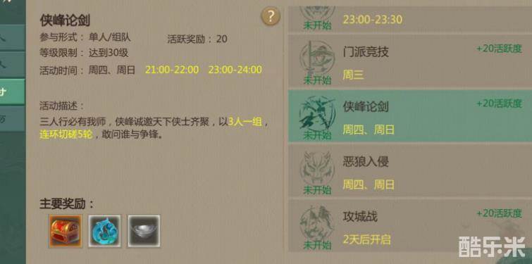 玩家进入游戏后,可以在主页面中看到多种不同活动,在定时活动中包括侠峰论剑活动,此活动可以是单人或多人挑战,每周四,周日的21:00-22:00,23:00-24:00开启,等级限制为30级,可以通过挑战此活动增加活跃度值20。