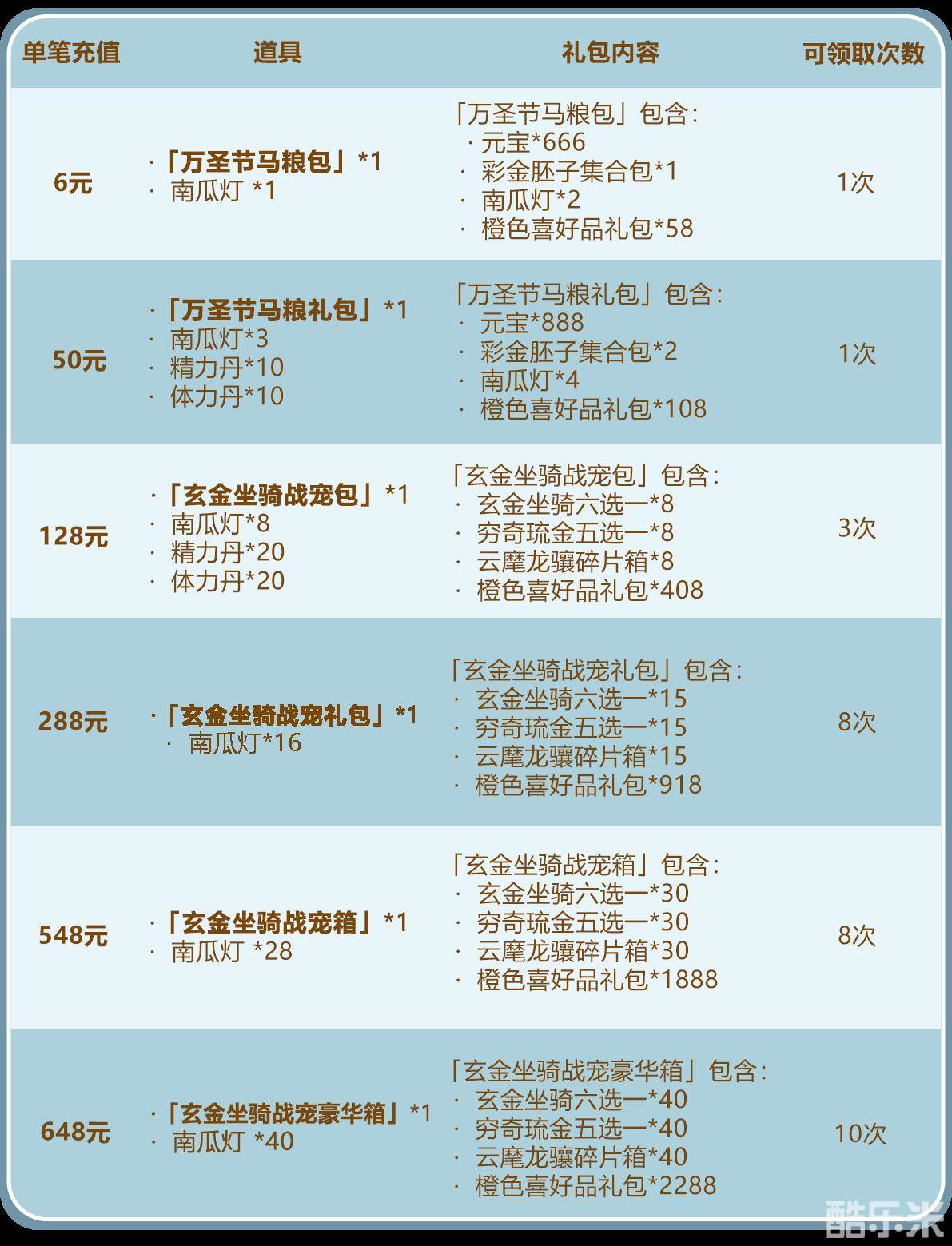 在活动期间少年们单笔充值至指定金额,即可获得玄金坐骑六选一、穷奇琉金五选一、云麾龙骧碎片箱、橙色喜好品礼包、南瓜灯等资源: